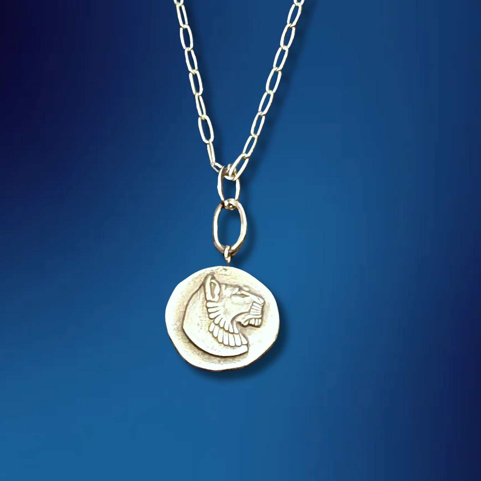This Egyptian Revival Lioness Pendant is likely Art Deco period and was made using a historical die on my hydraulic press. Sterling Silver with 18" sterling silver chain.