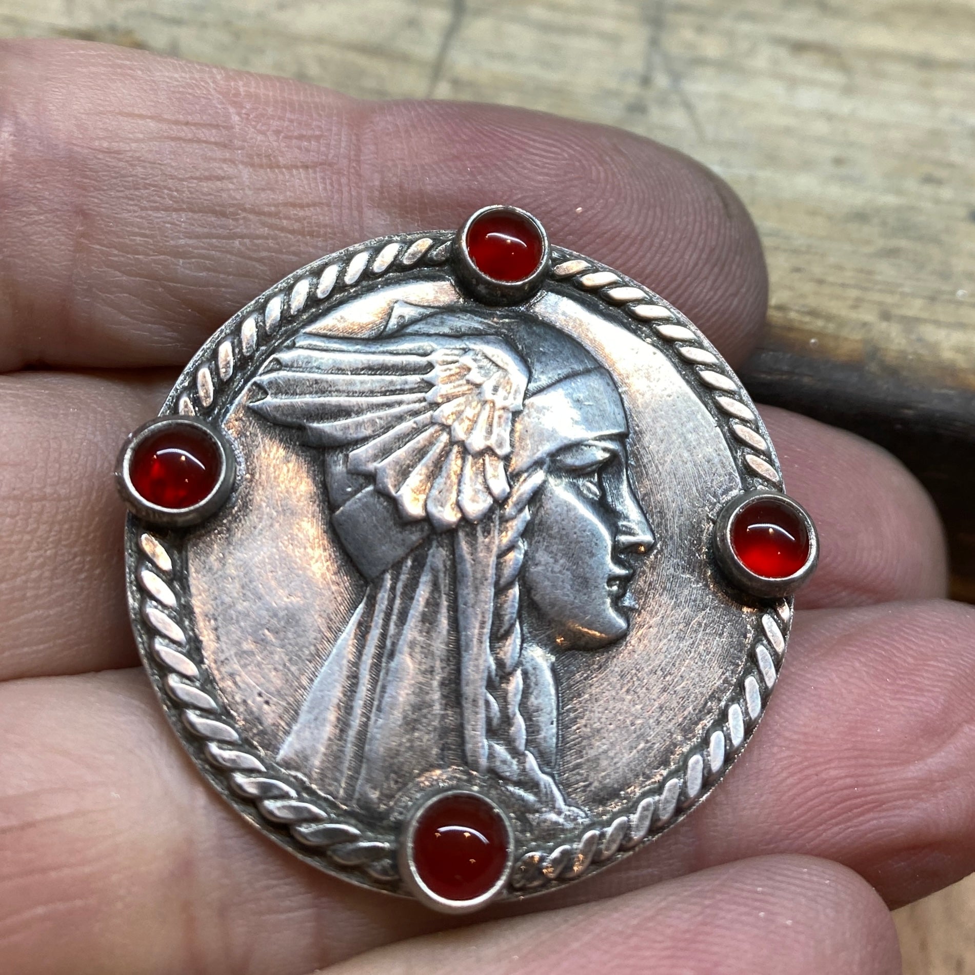 This medallion honors that spirit. Struck from an antique die and finished by hand, its intricate form recalls the shields and flight of those legendary figures. Four warm carnelian cabochons - stones of courage and vitality - surround the silver centerpiece, their deep flame hue echoing both battle fire and sacred heart.